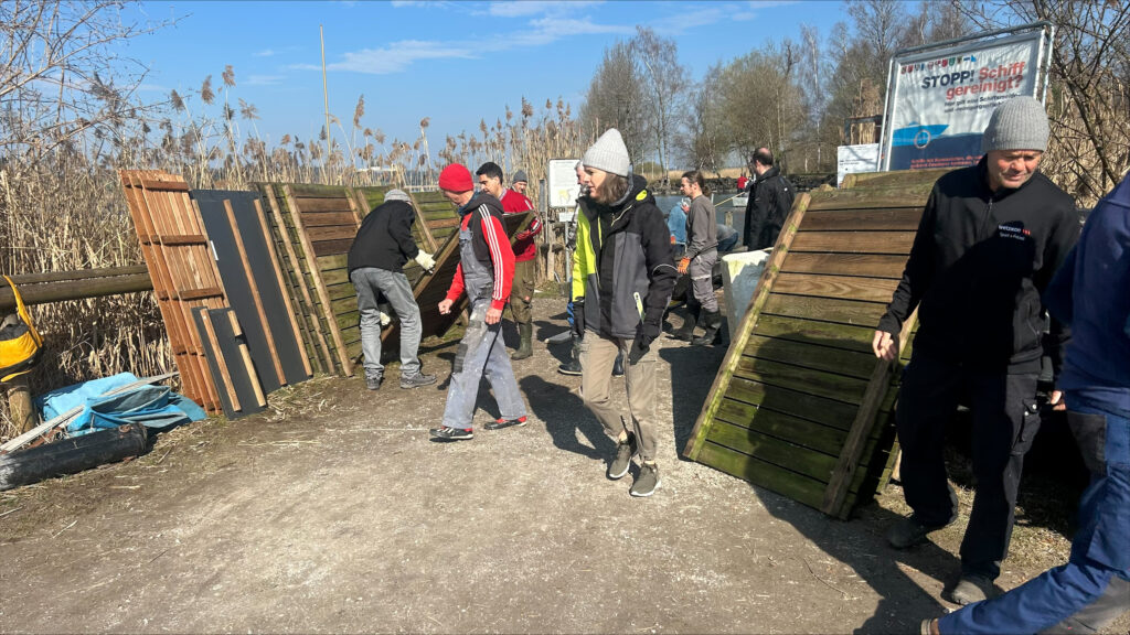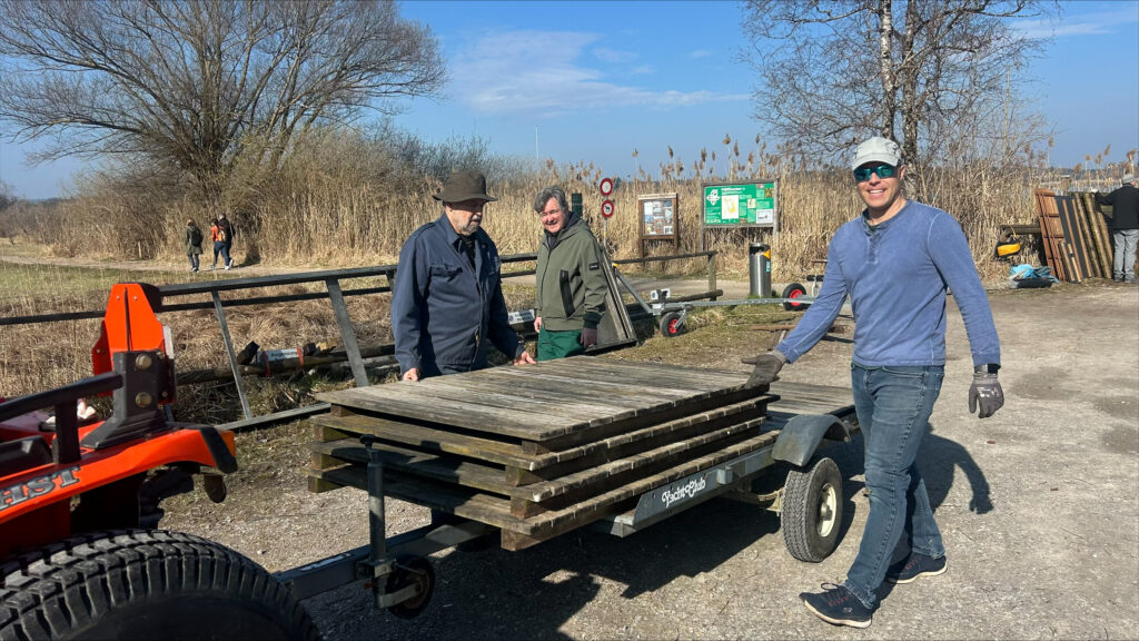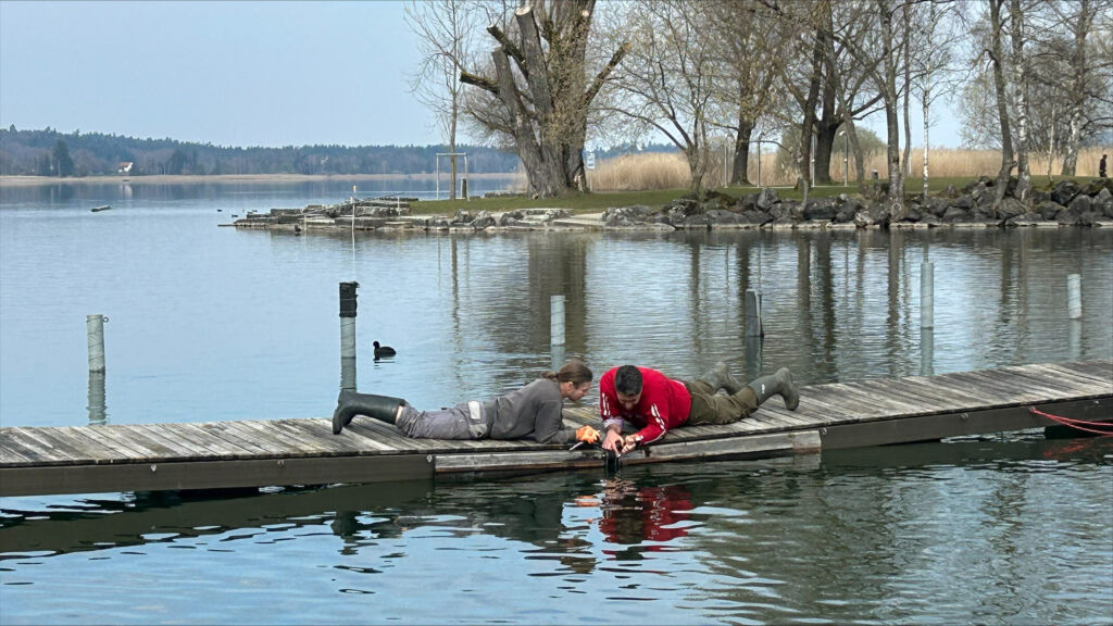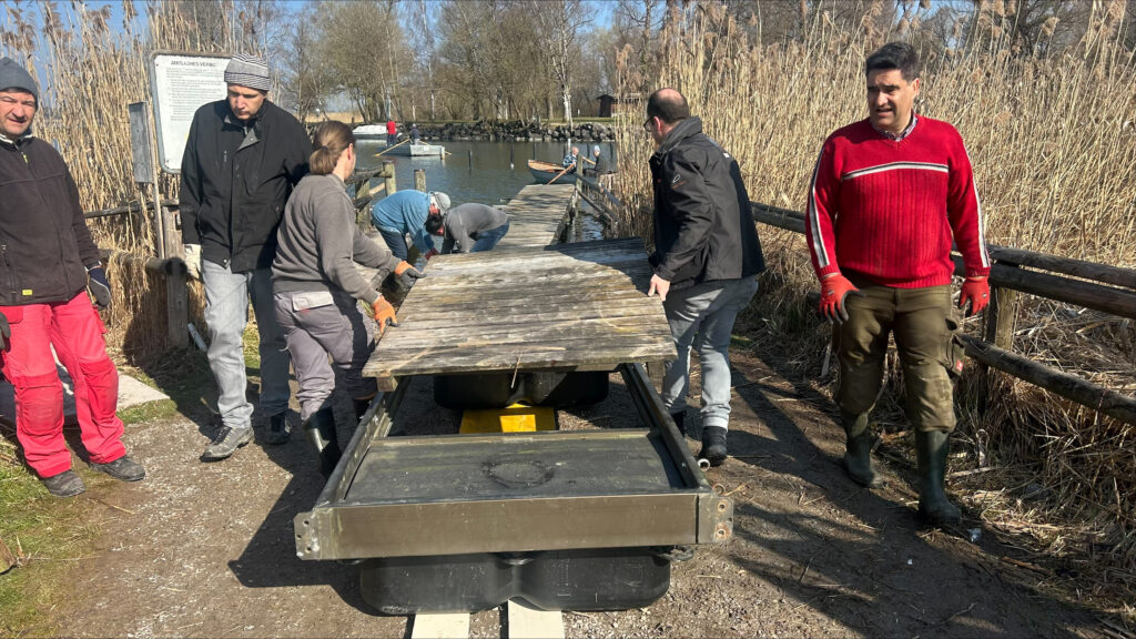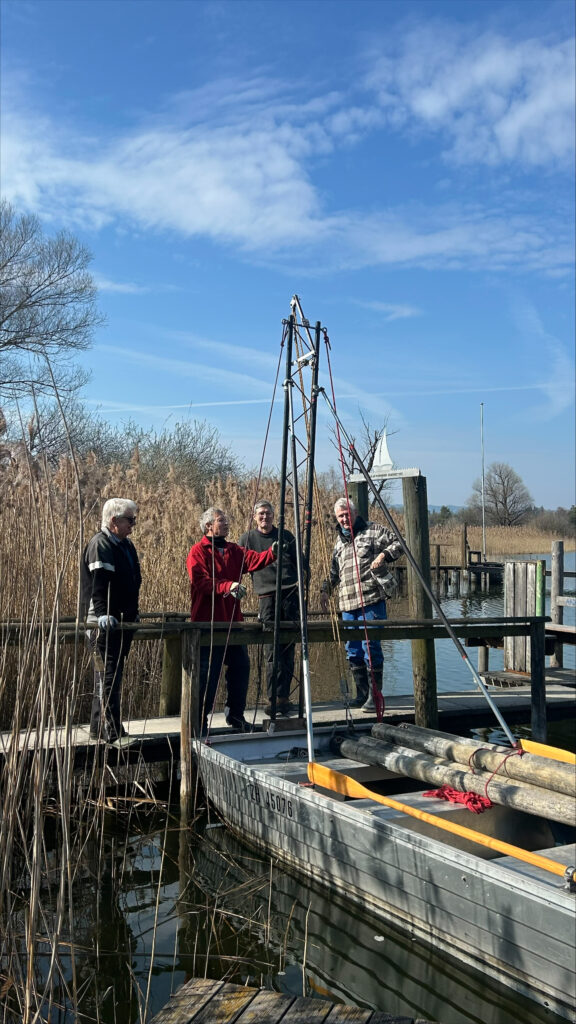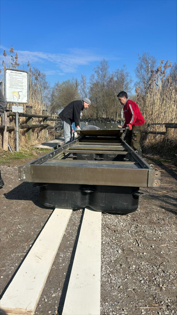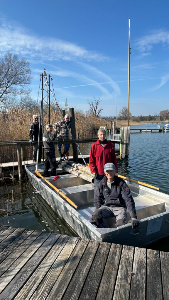 Dieses Jahr erwartete uns eine Premiere: Die rund 30 Jahre alten Styroporschwimmer hatten ausgedient und wurden durch neue Polyethylenschwimmer ersetzt. Und tatsächlich – sie passten wie massgeschneidert. Unter den wachsamen Augen von Dominik glitten die neuen Schwimmer auf einer Rampe aus Schalungsbrettern sanft unter die Stegelemente und fanden ihren Weg ins Wasser. Umso überraschender kam für viele der Ruf zur Kaffeepause.